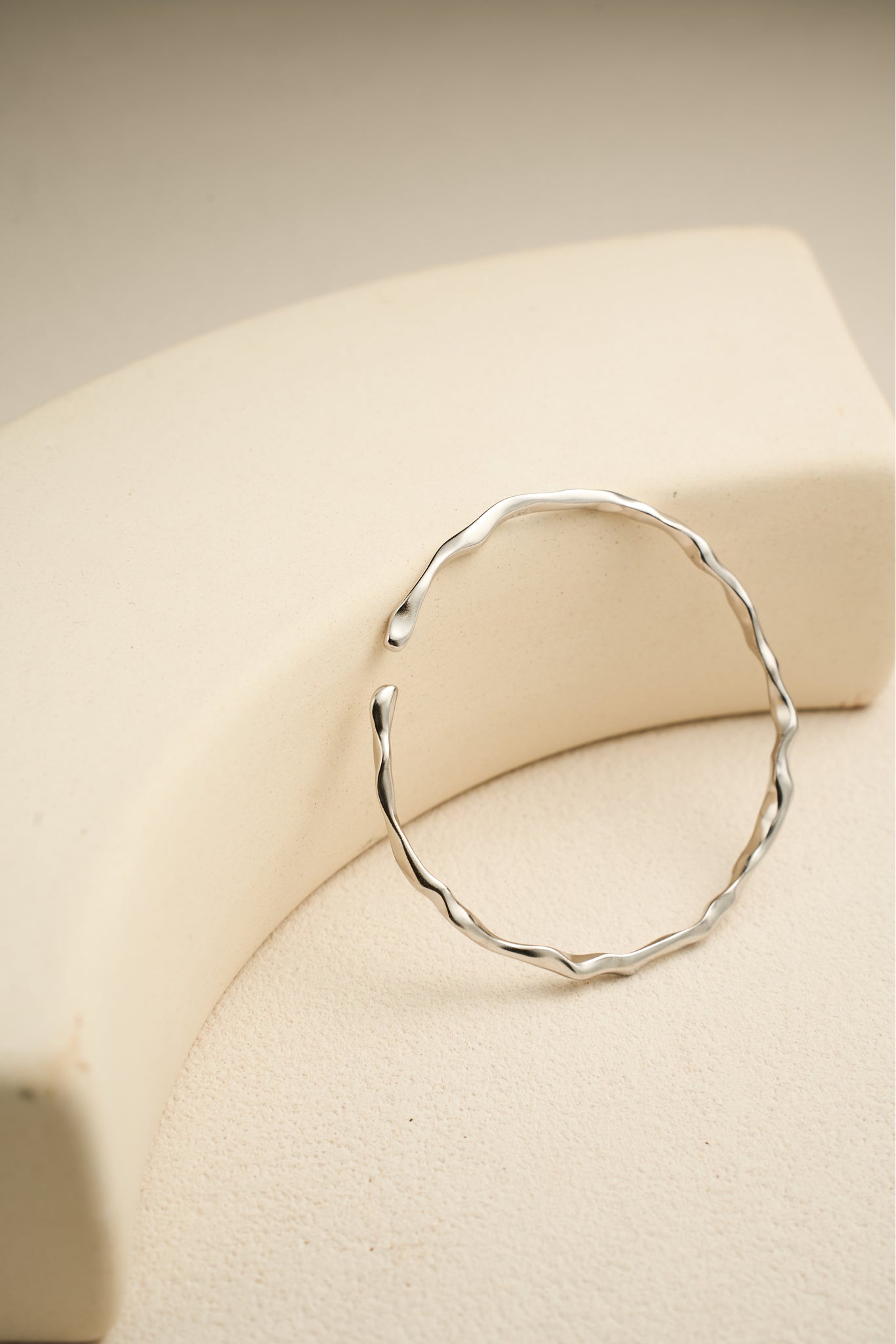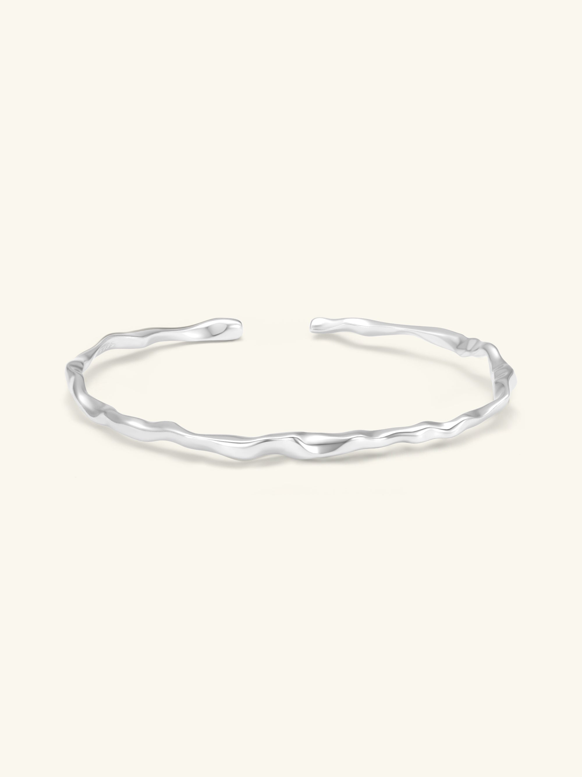 Inspired by the fluid rhythm of moving water, this open bangle features a soft, flowing texture that wraps around the wrist with effortless elegance. Each ripple is shaped through high-temperature pressing and refined by hand, creating a natural wave pattern that shifts with the light. Minimalist yet expressive, it brings a sense of movement and quiet luxury to any look.