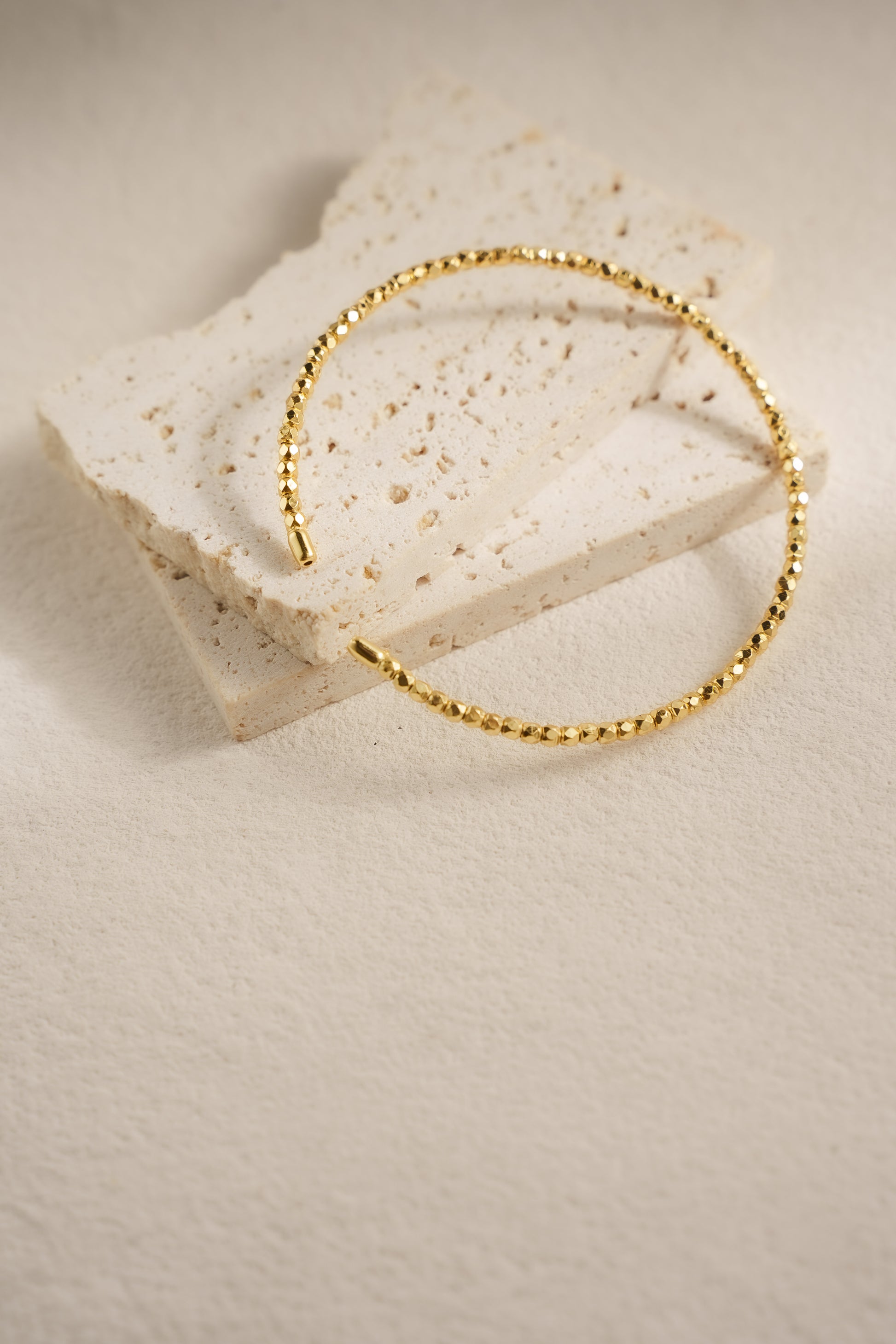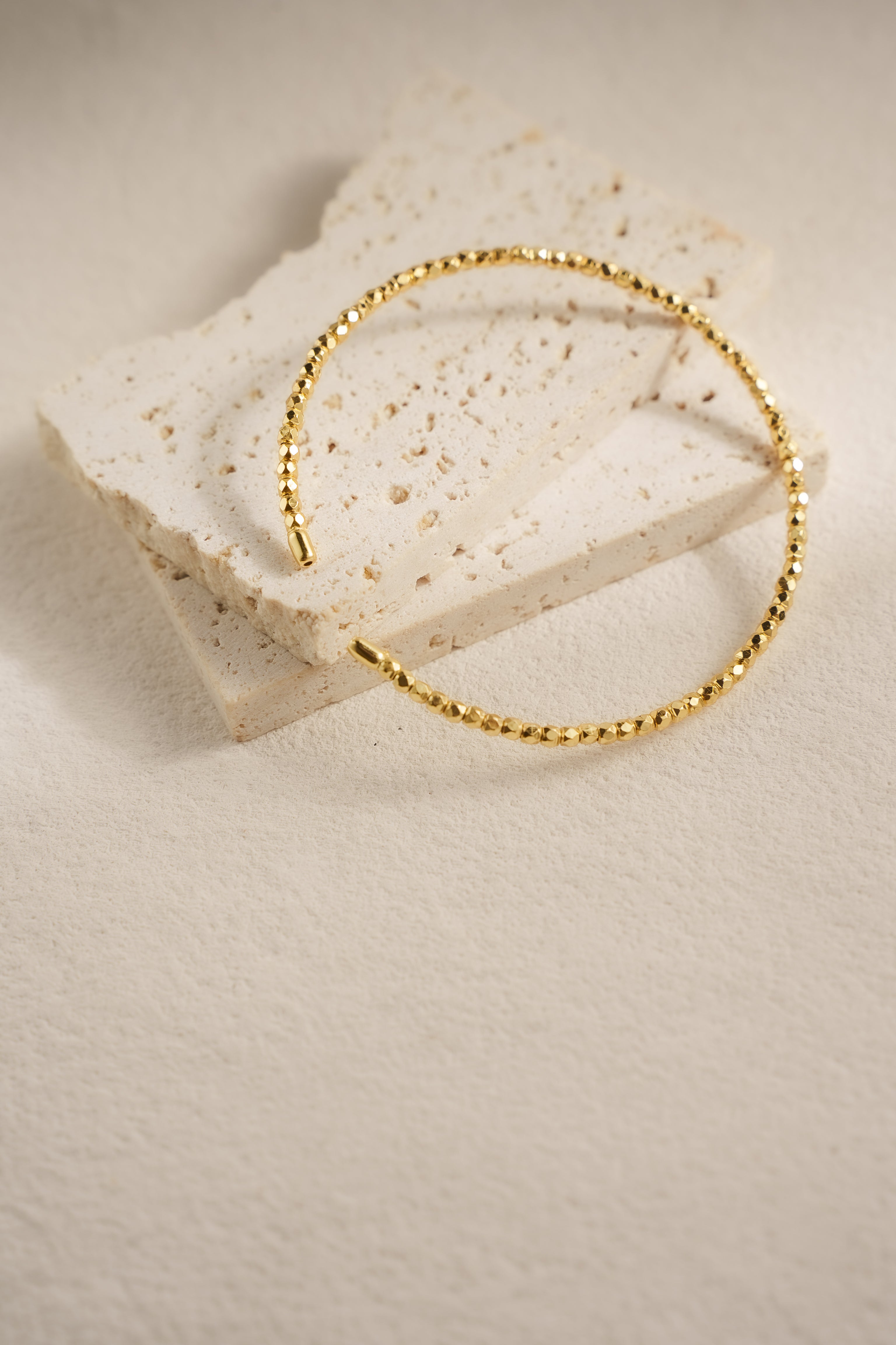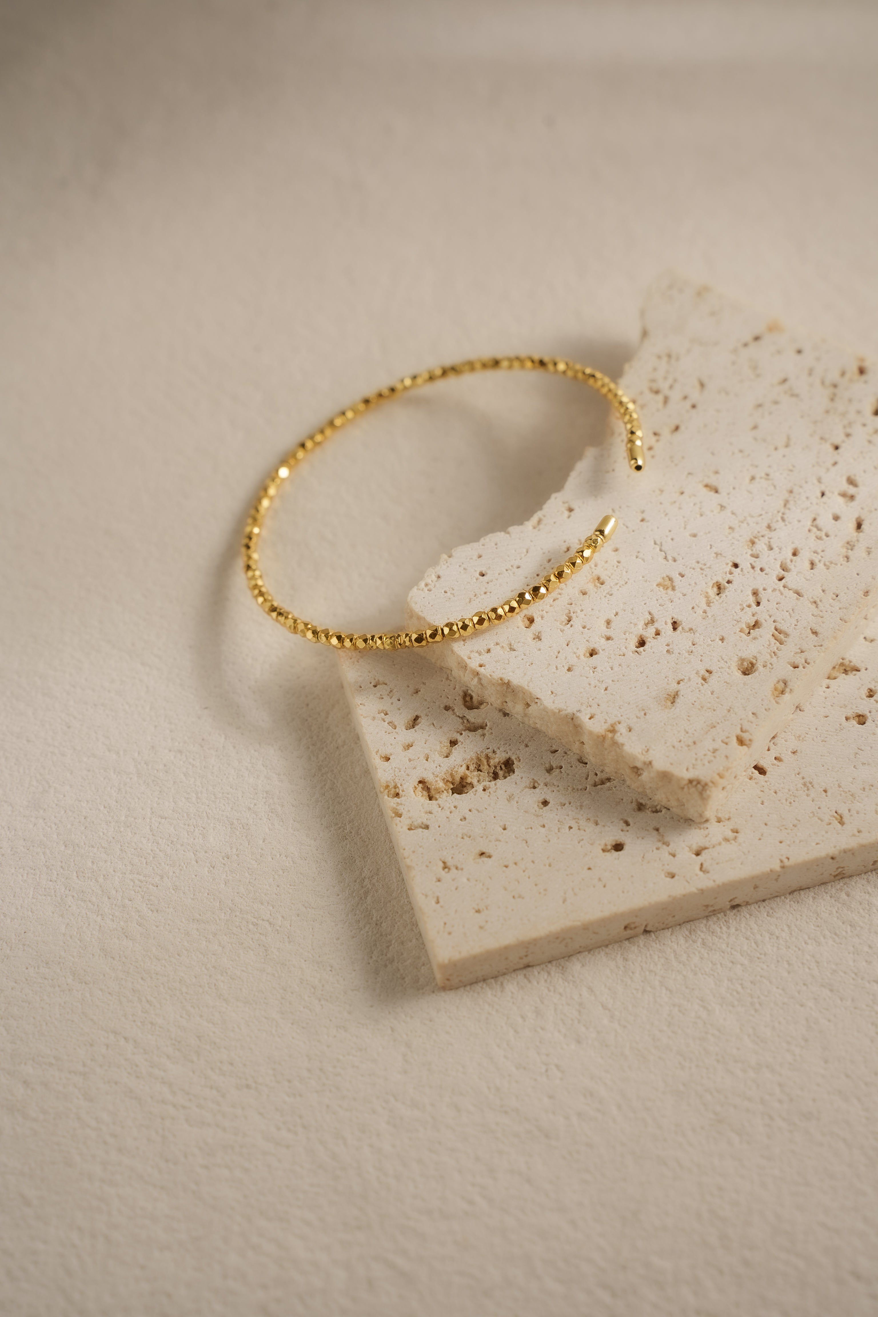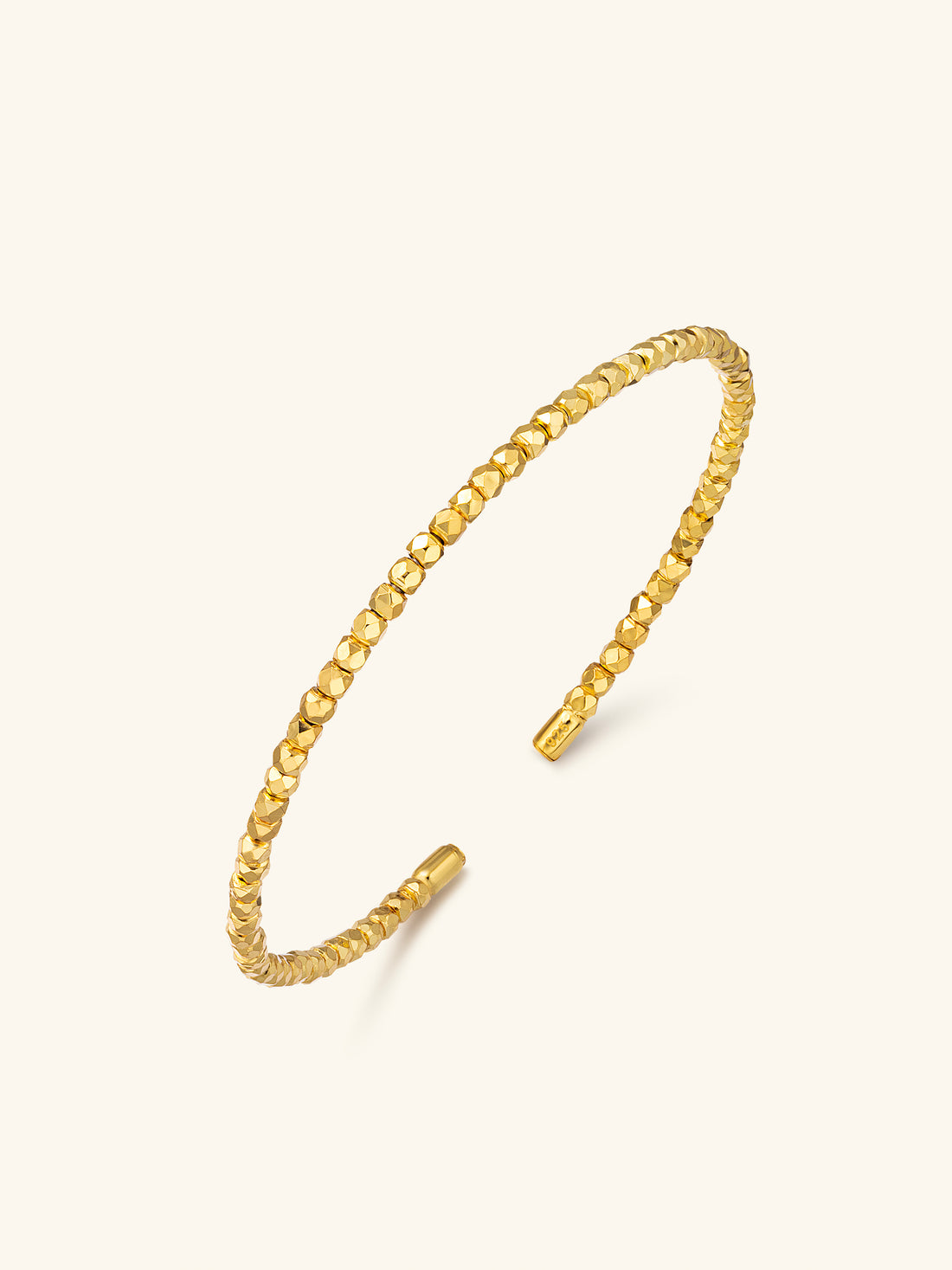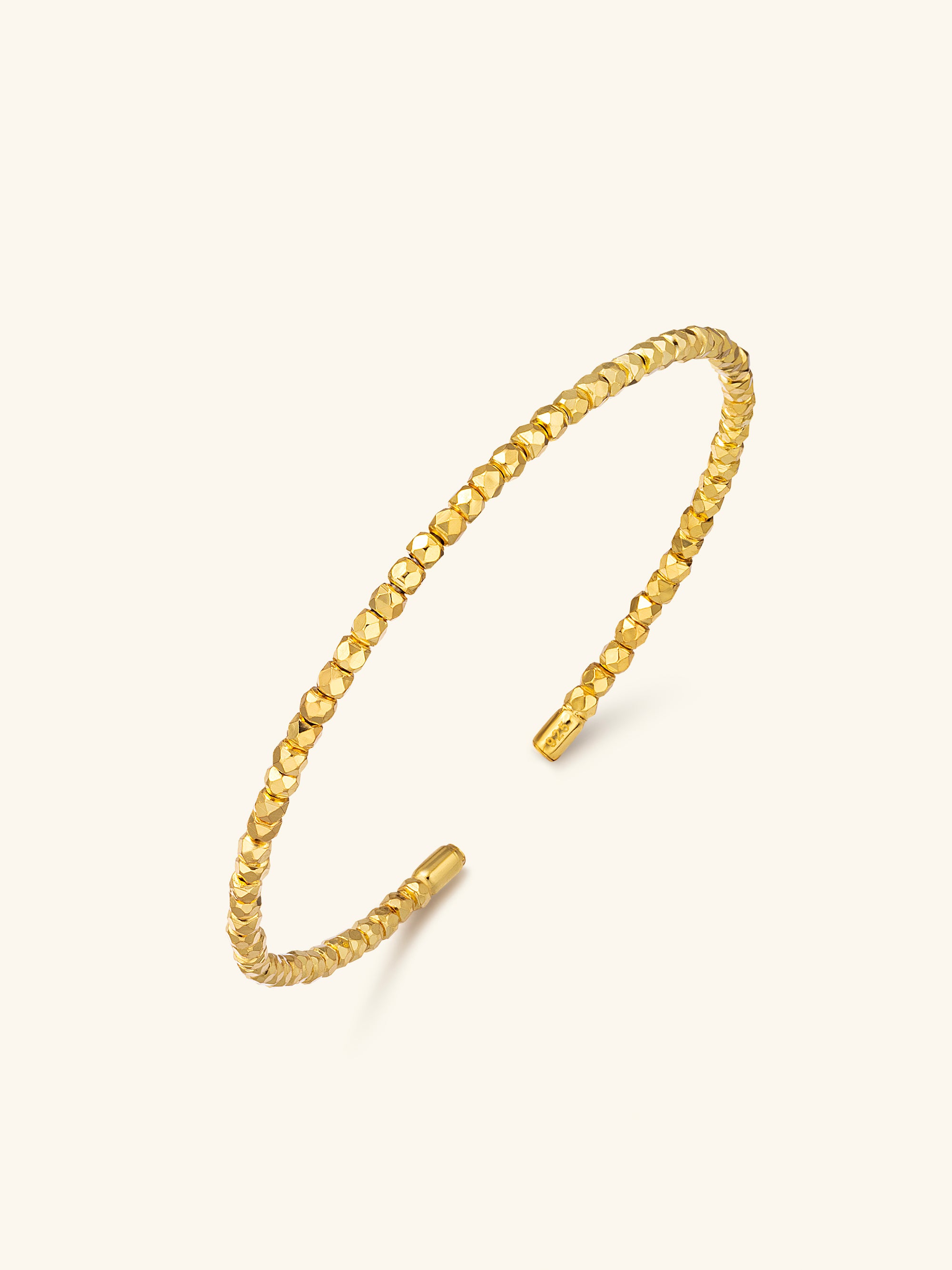 The Geometric Order Bangle draws inspiration from the beauty of rhythm and symmetry. Its precisely faceted texture creates a mirror-like brilliance, symbolizing the harmony between order and individuality. Each reflection captures a fragment of light, echoing the timeless charm of geometric aesthetics.