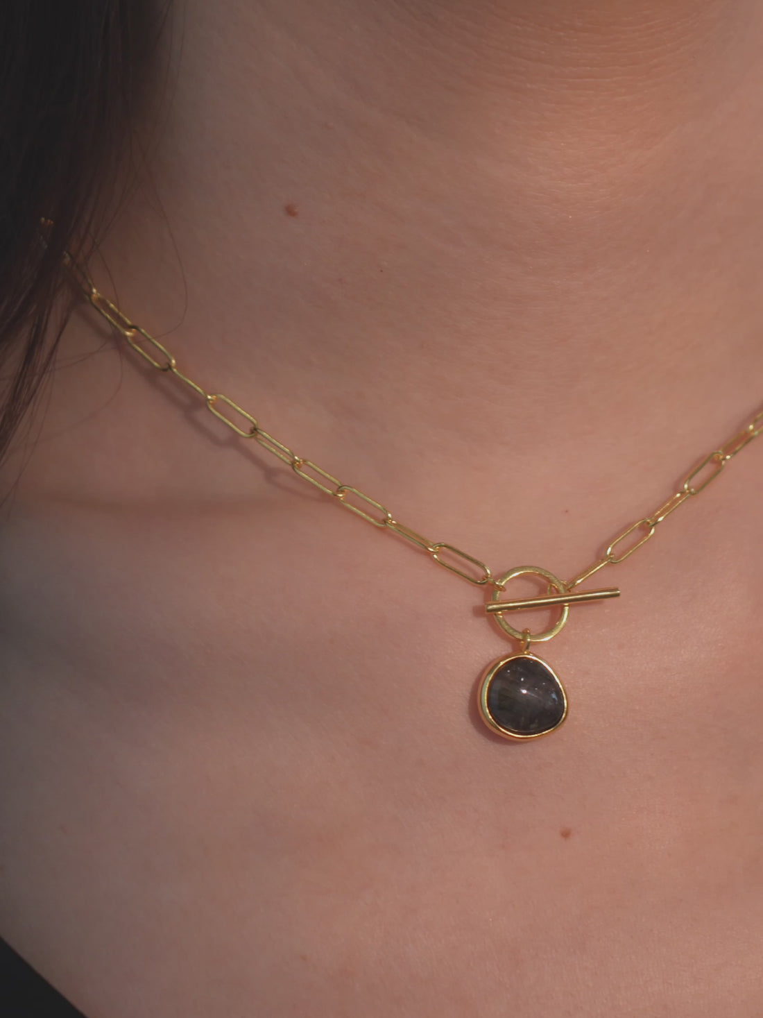Inspired by the graceful movement of stellar orbits, this necklace pairs a retro OT clasp with a natural labradorite pendant. The stone’s cool, shifting glow mimics celestial trails, creating a piece that feels both modern and quietly mysterious.