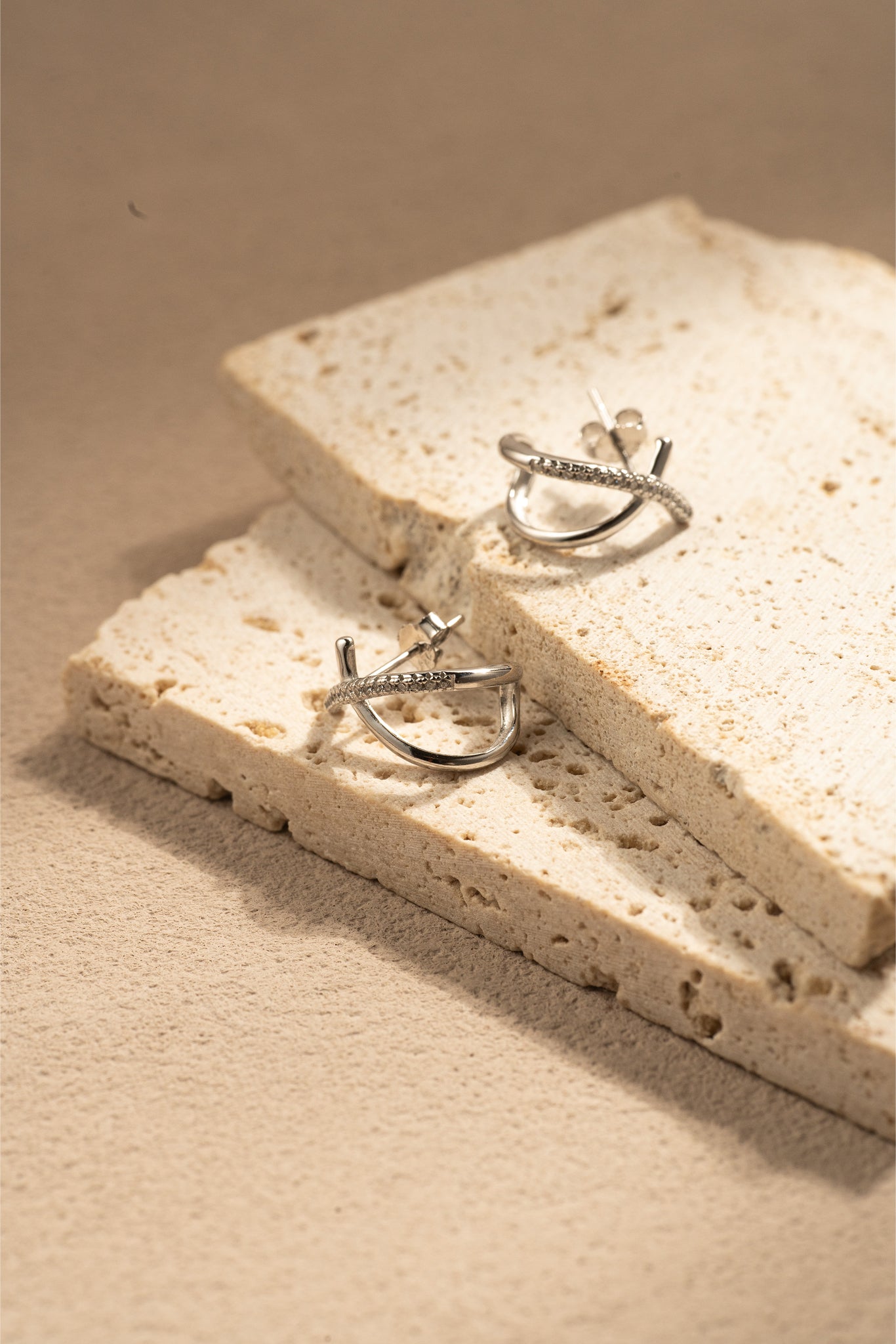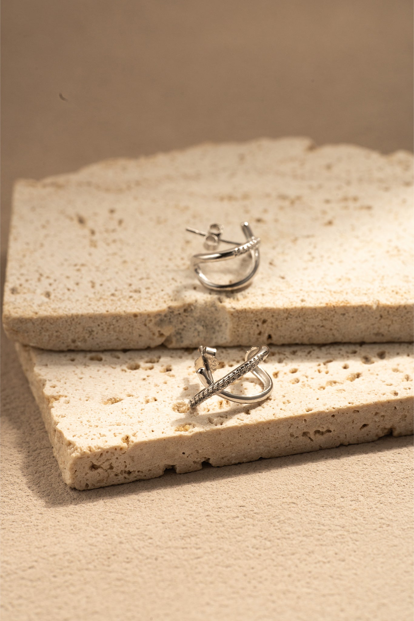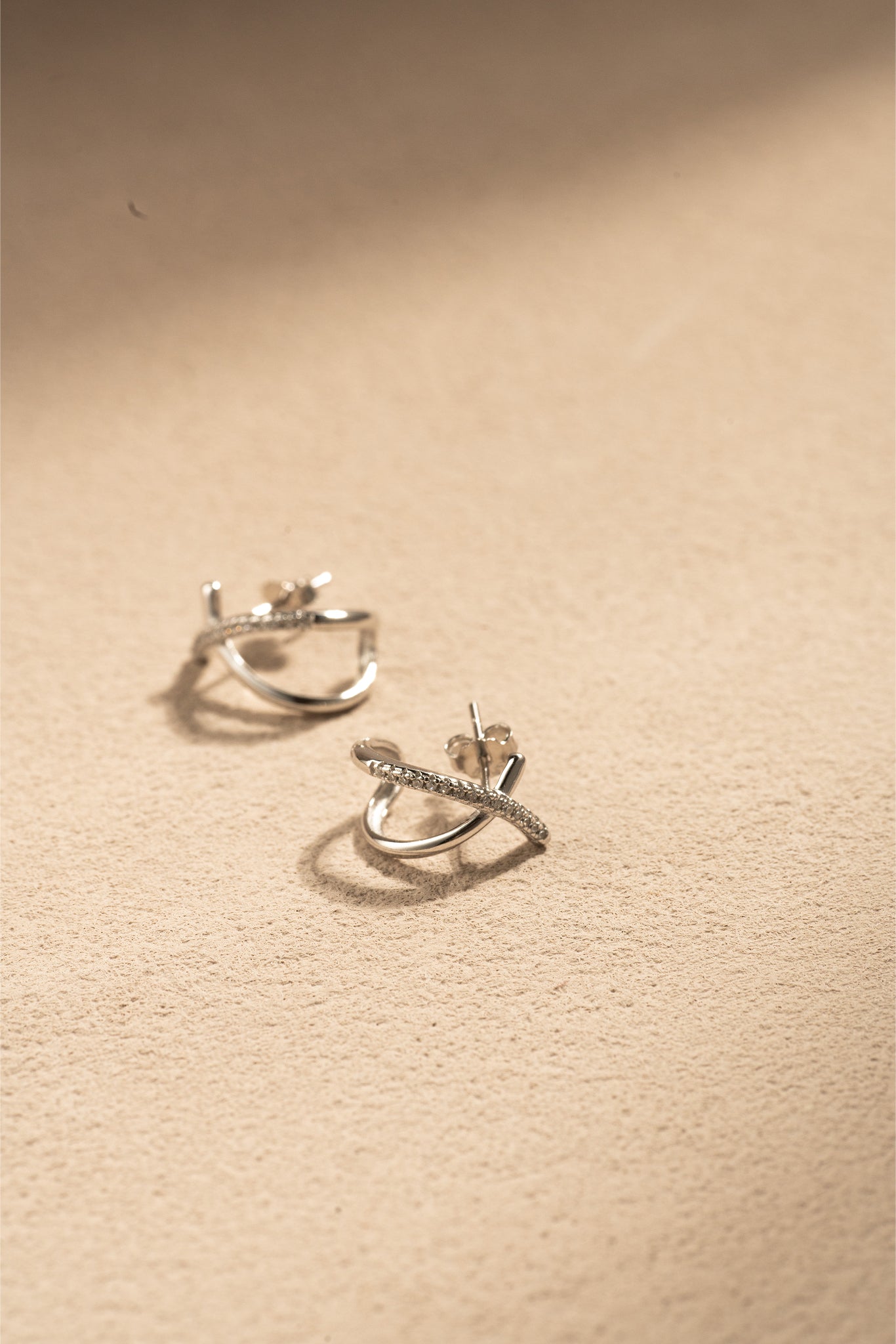Intertwined Gleam – Sparkling Crossover 925 Silver Earrings in White Gold