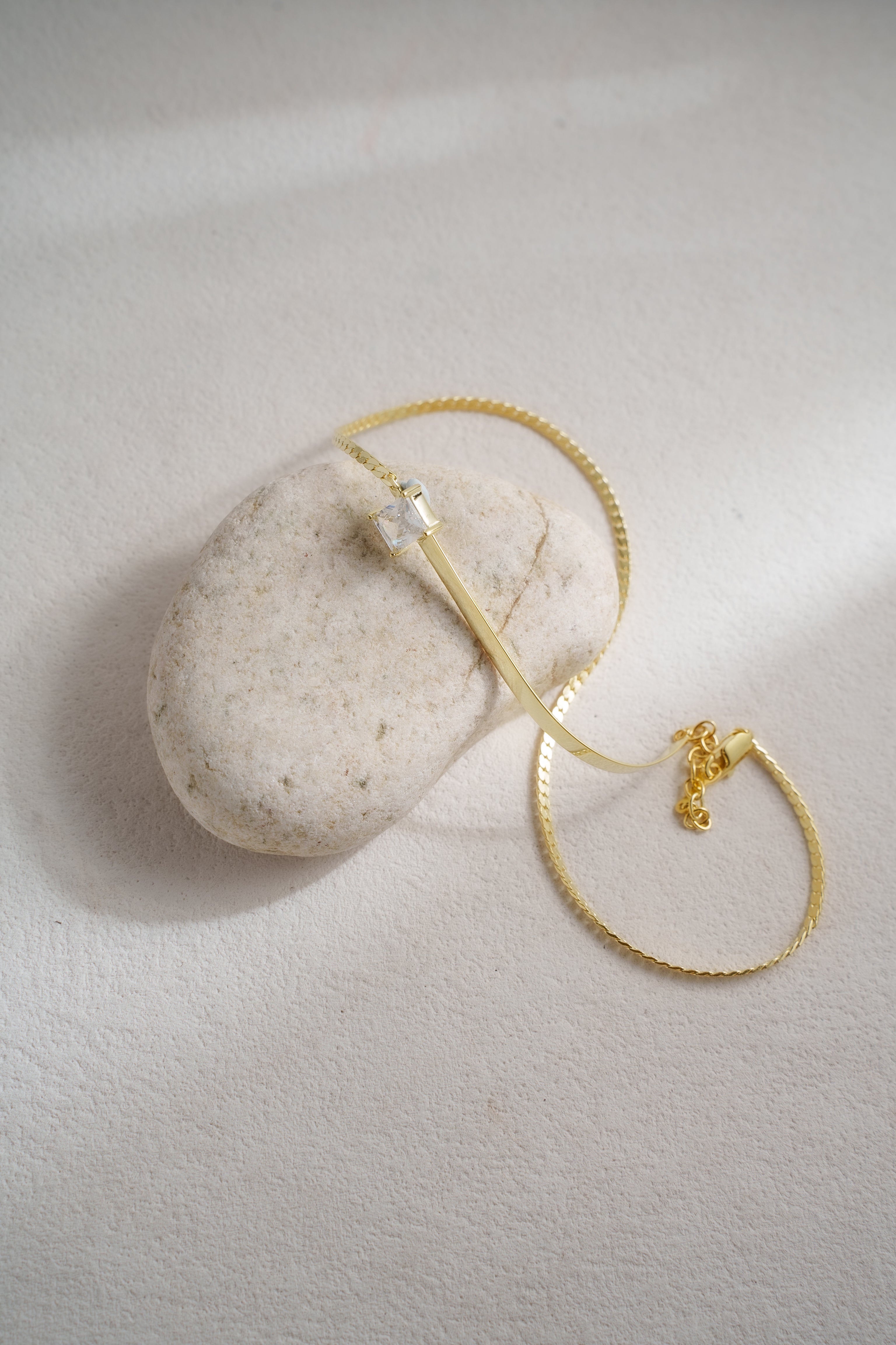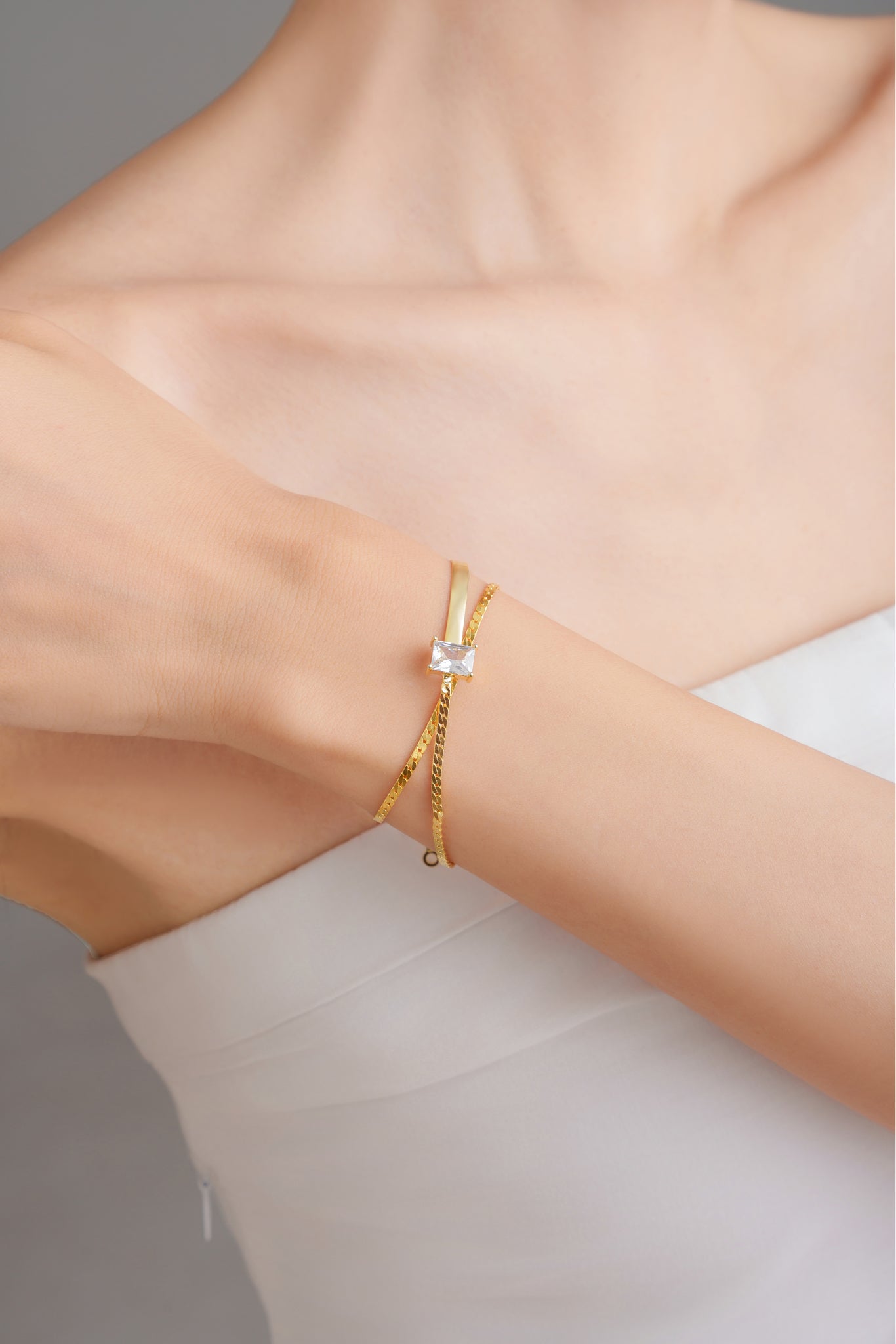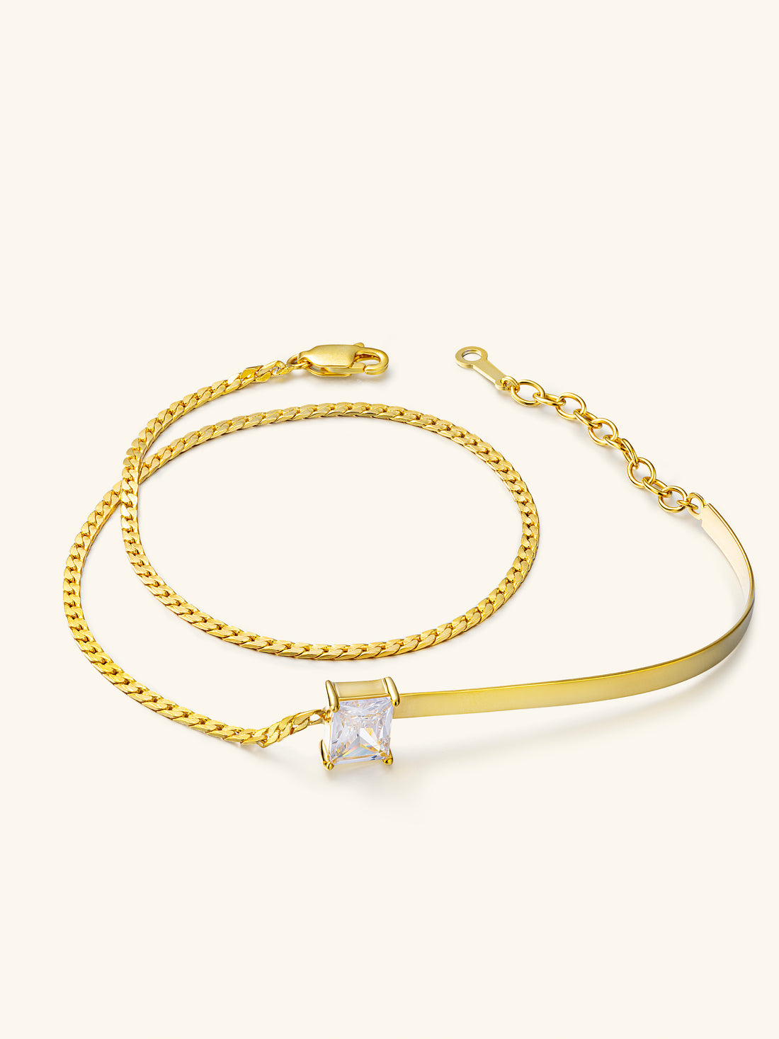 Inspired by the interplay of light and shadow, the double-layered chain embodies a balance between order and freedom. The central square stone radiates like a serene light in the urban night, mirroring the wearer’s quiet brilliance.