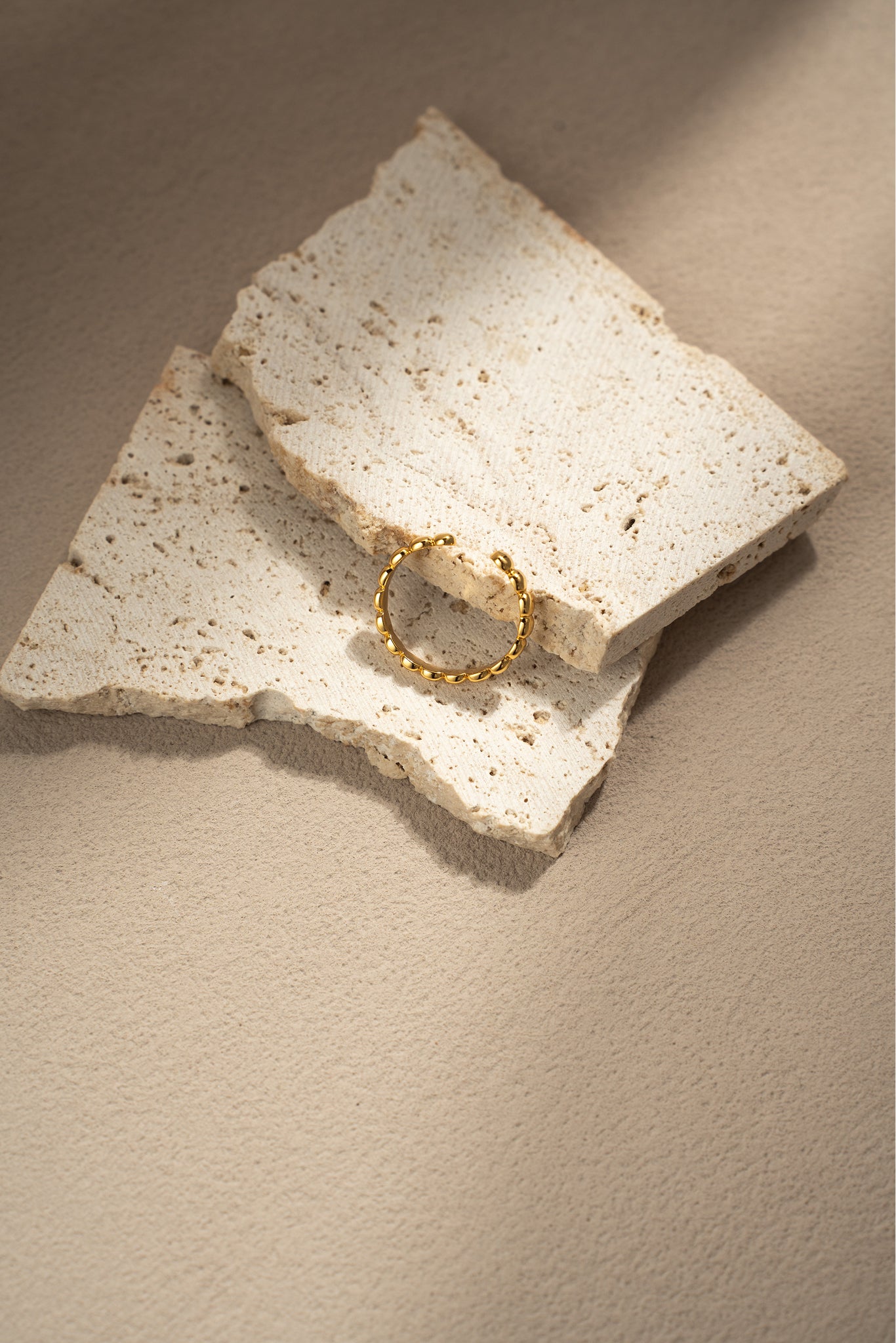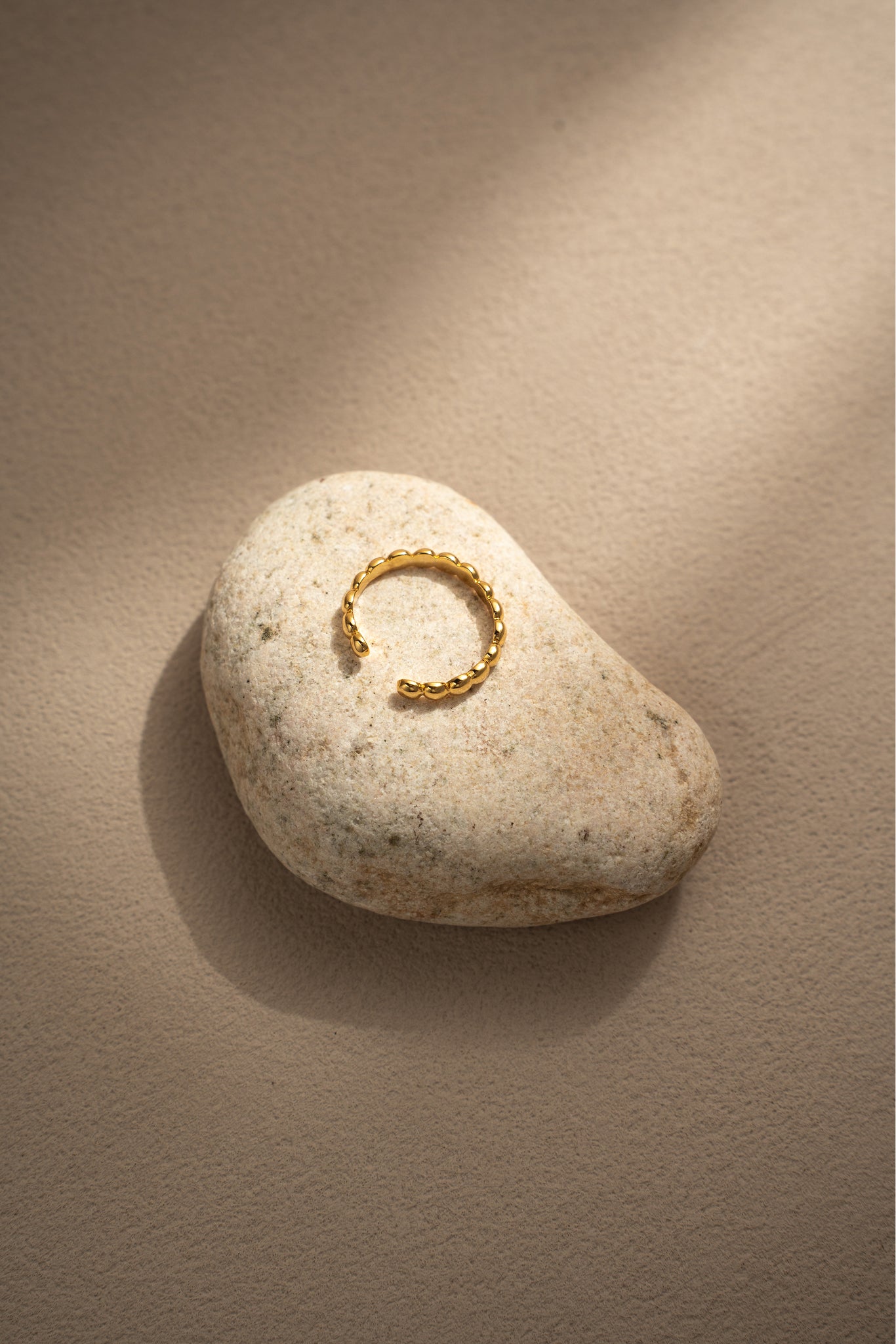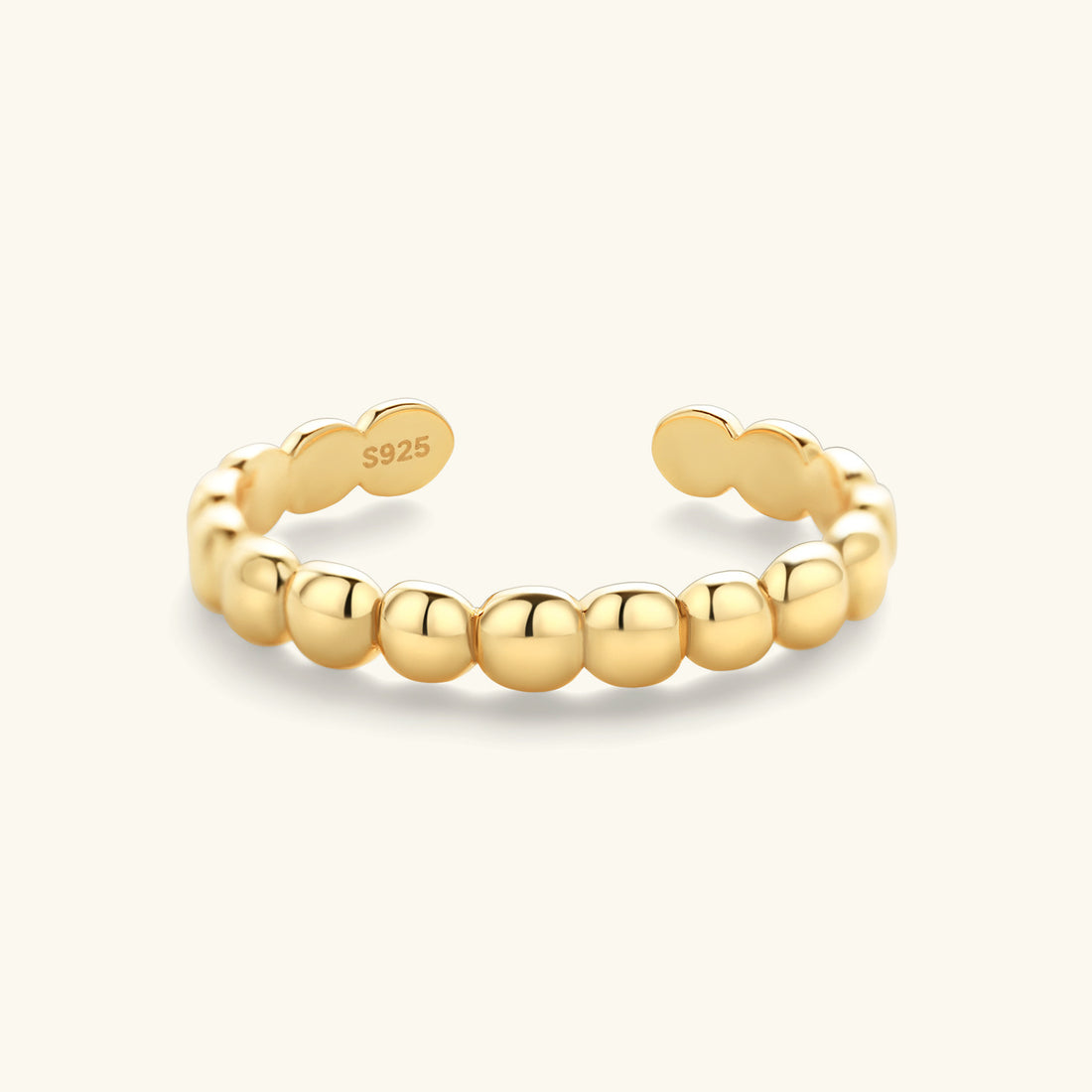 Inspired by plump, rounded beads, this ring is crafted from 925 sterling silver and finished with 18K gold plating. The polished surface gives off a soft, luxurious shine, while the open-end design makes it adjustable and comfortable to wear. Perfect as a minimalist statement on its own or layered with other rings for a bolder look.