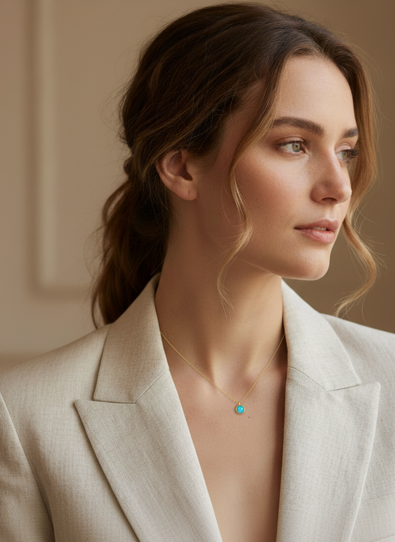 A delicate turquoise necklace crafted in 925 sterling silver and finished with 18K gold plating. The petite 4mm stone is set in a clean bezel frame, highlighting its natural ocean-like color. Lightweight, understated, and refreshing — perfect for adding a soft touch of color to your everyday look.