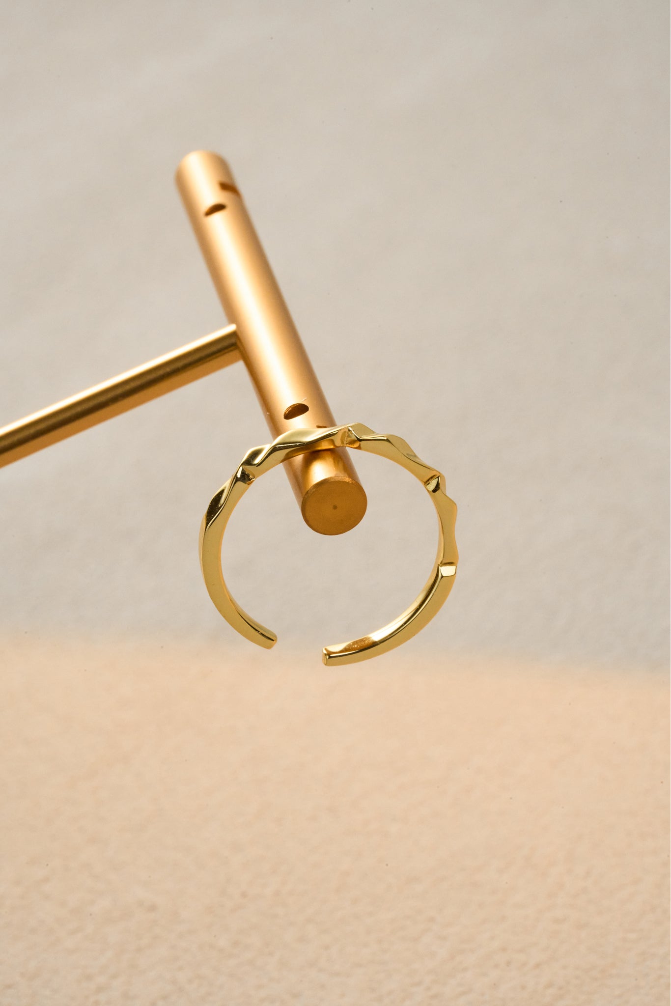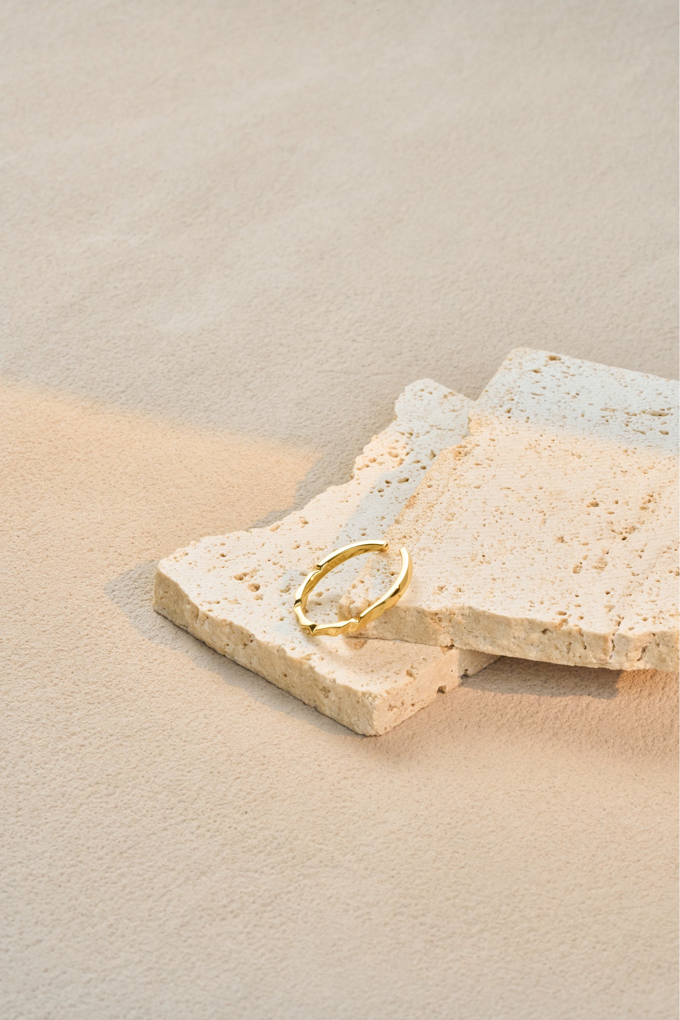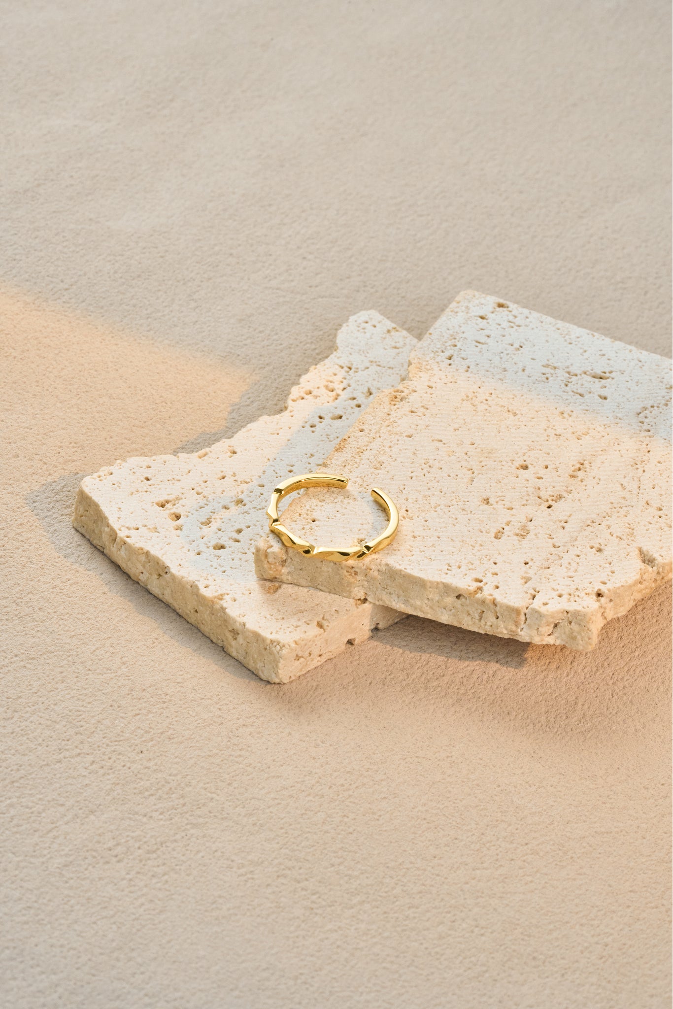 This ring draws inspiration from rippling morning light reflected on water. With twisted multi-faceted sculpting, the design captures subtle movement and light play. It's understated yet luminous, like a whisper of sunlight wrapped gently around your finger.