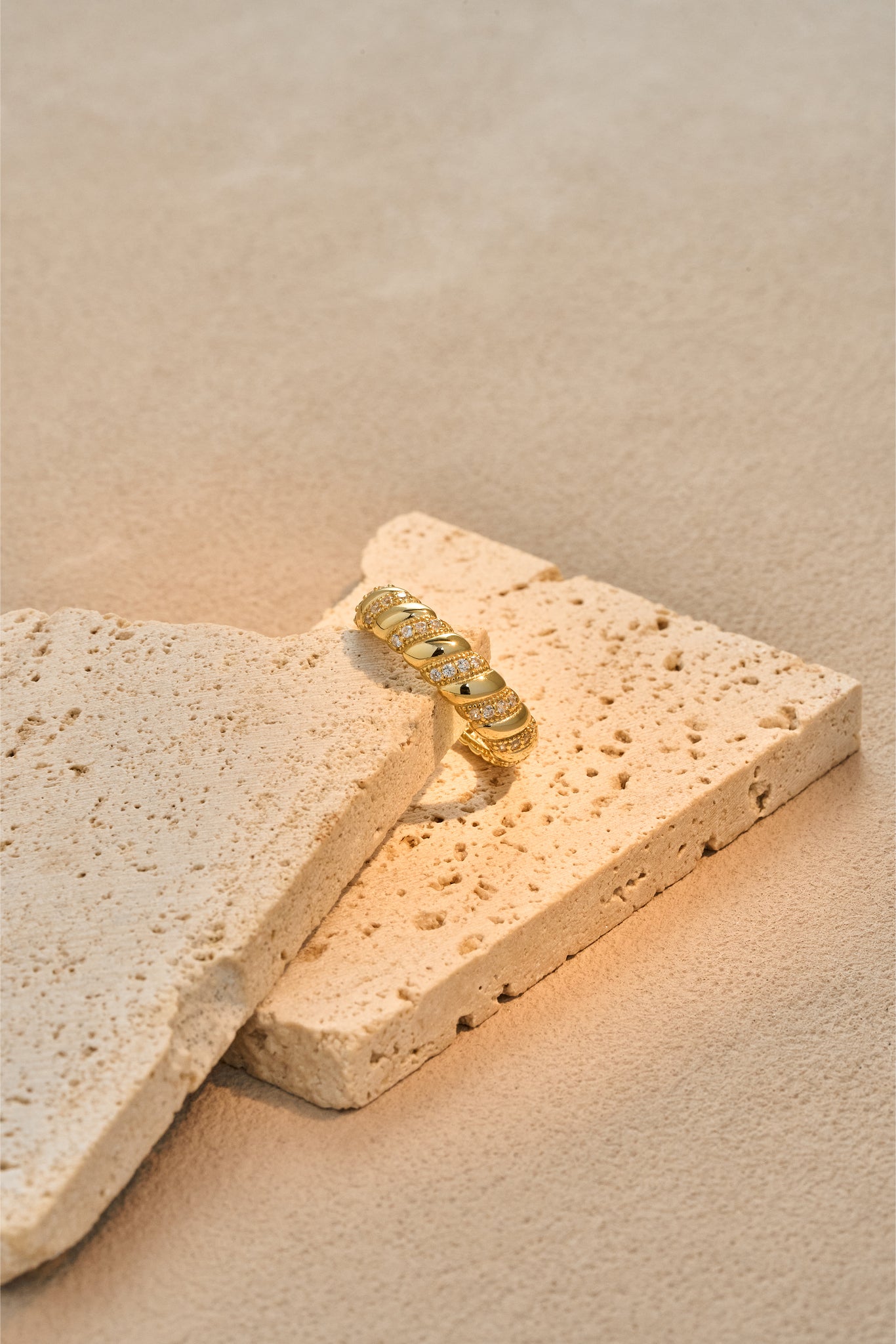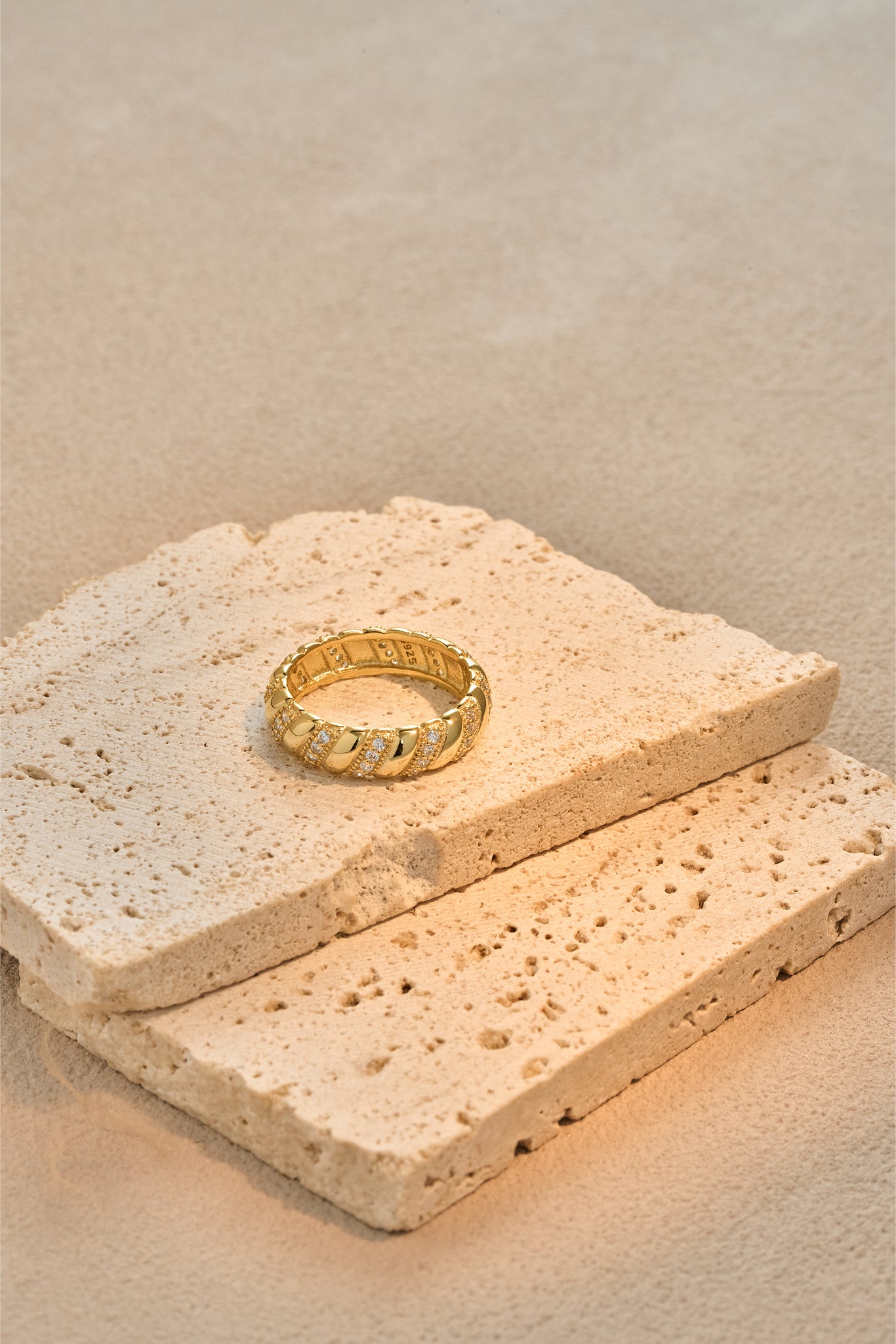Inspired by the elegant rhythm of twisted textures, this band ring merges smooth arcs with pavé-set stones, creating a dynamic play of light and shadow. The design symbolizes strength intertwined with grace, offering a modern reinterpretation of timeless jewelry craft.